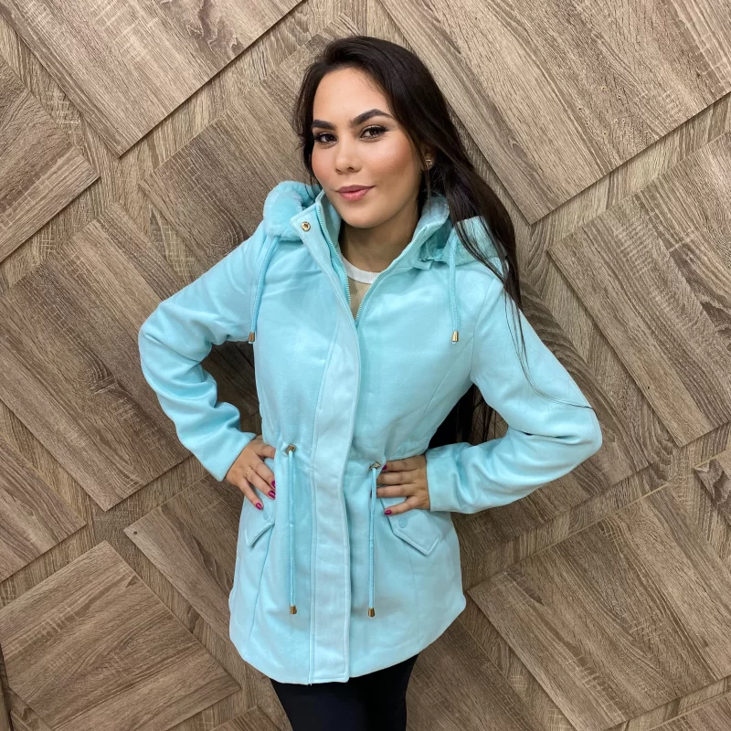 PARKA EM TECIDO DE LÃ BATIDA, CAPUZ REMOVÍVEL. NÃO TEM PELUCIADO POR DENTRO