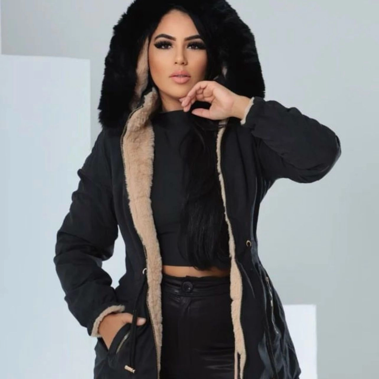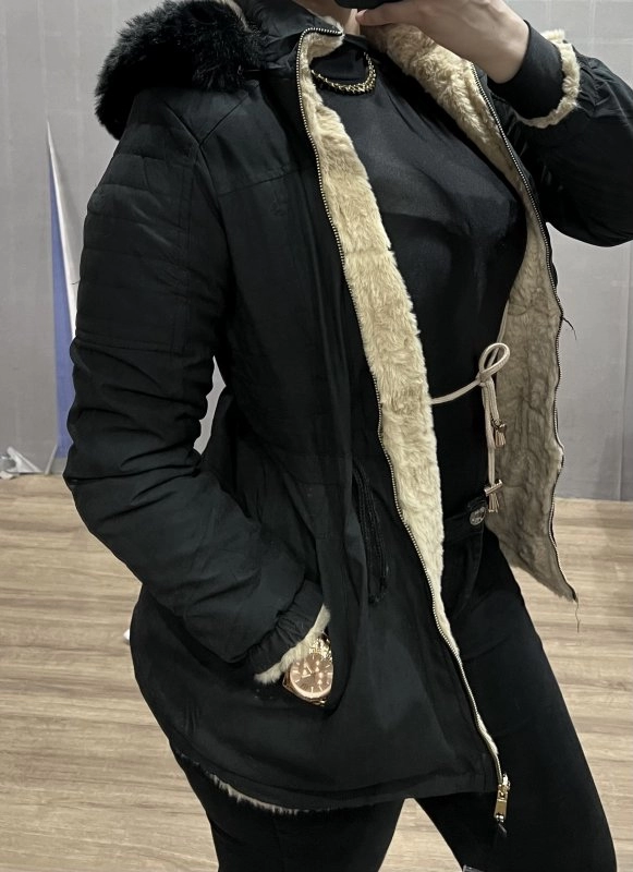 PARKA DUPLA FACE EM TECIDO DE SARJA COM TEDDY, SUPER QUENTINHA, COM AJUSTE NA CINTURA DOS DOIS LADOS. CAPUZ REMOVÍVEL