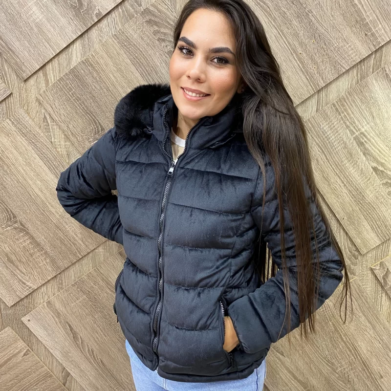 JAQUETA EM TECIDO DE VELUDO, PELUCIADO POR DENTRO, CAPUZ REMOVIVEL