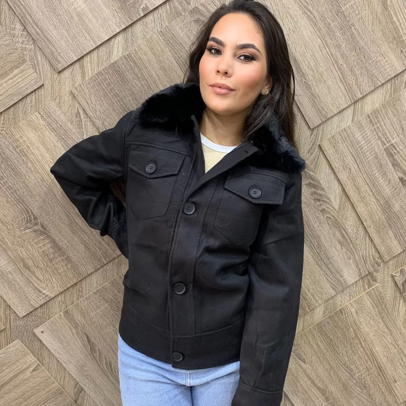 JAQUETA EM LÃ BATIDA SEM PELUCIADO POR DENTRO, PELÚCIA DO PESCOÇO