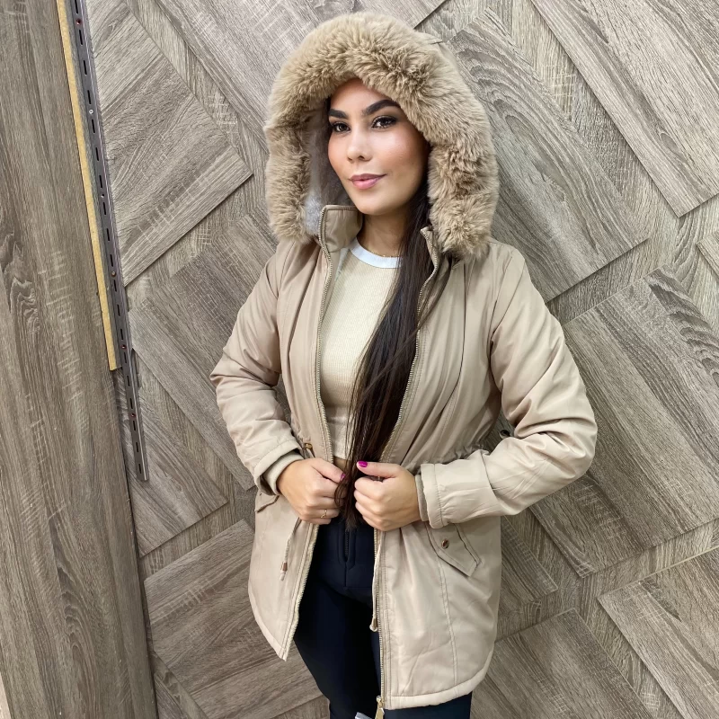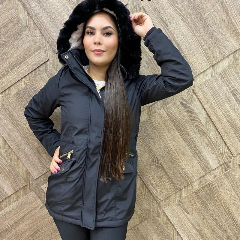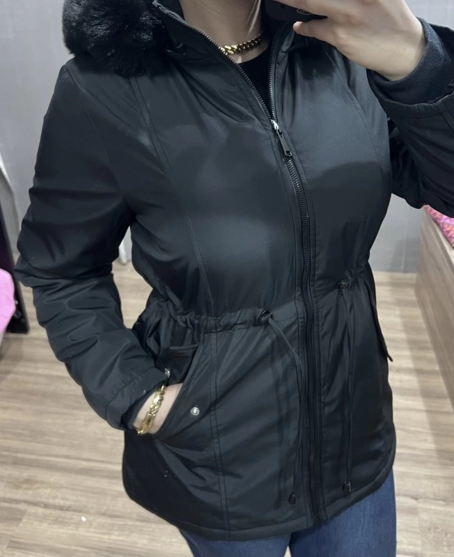 SOBRETUDO EM TECIDO DE NYLON, COM PELUCIADO POR DENTRO, CAPUZ REMOVIVEL, AJUSTE LATERAL.