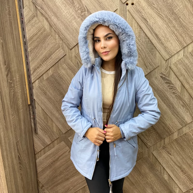 PARKA EM TECIDO DE NYLON, PELUCIADA POR DENTRO CAPUZ RELOVIVEL, AJUSTE NA CINTURA
