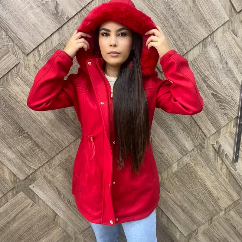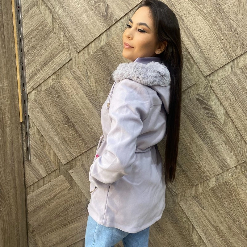 SOBRETUDO EM TECIDO DE LÃ BATIDA, NÃO TEM PELUCIADO POR DENTRO, CAPUZ REMOVÍVEL AJUSTE NA CINTURA.