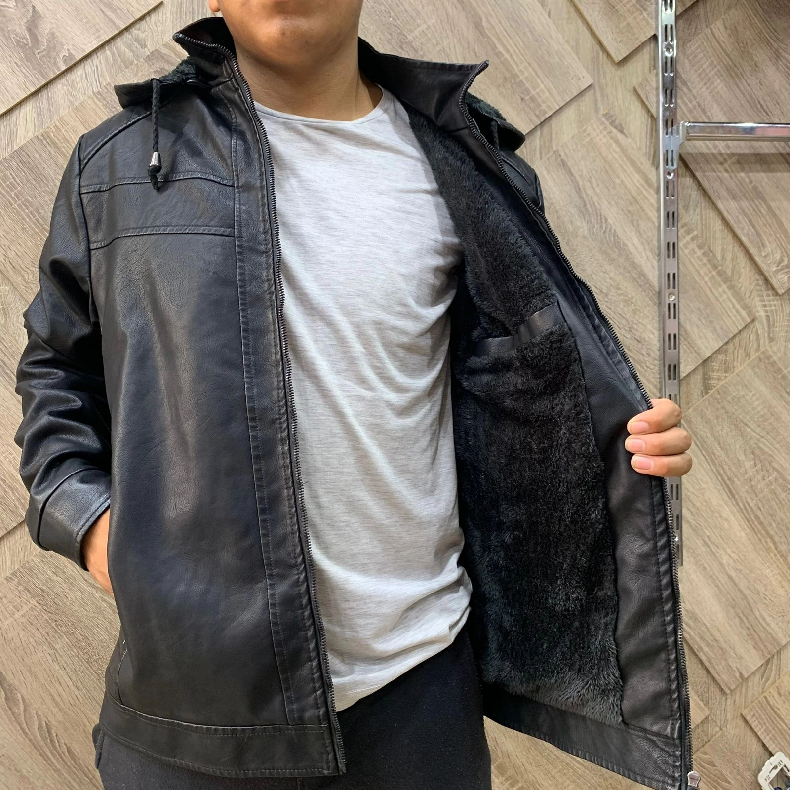 JAQUETA EM TECIDO DE COURINO PELUCIADO POR DENTRO, CAPUZ REMOVÍVEL